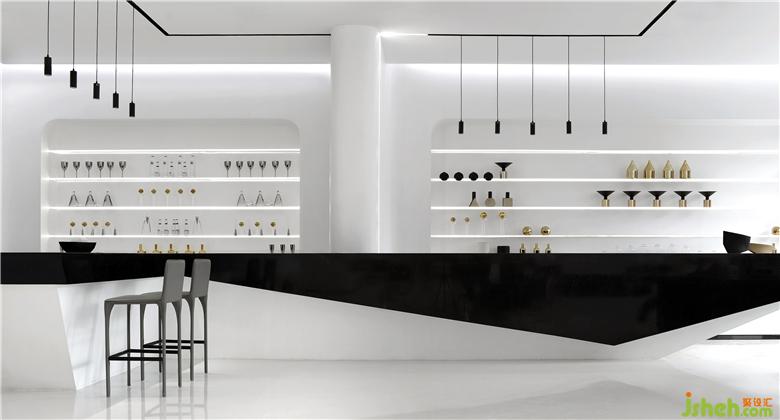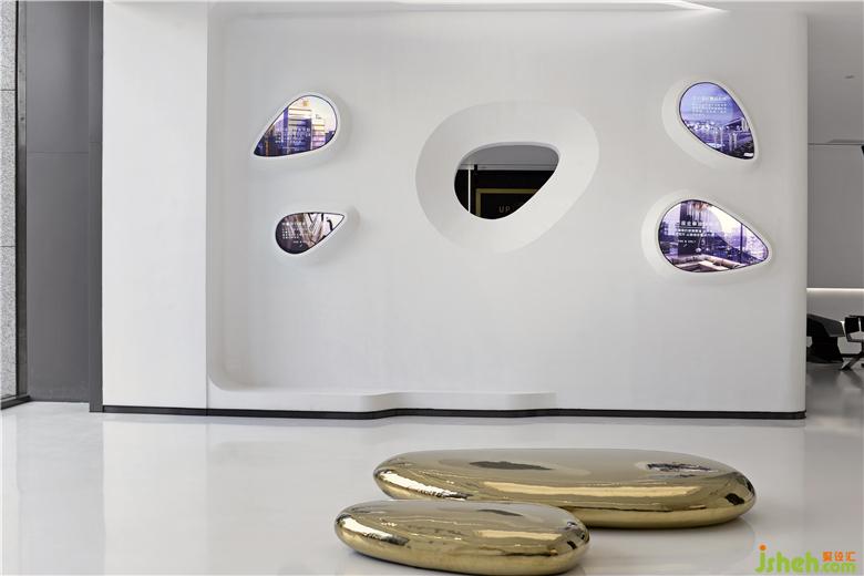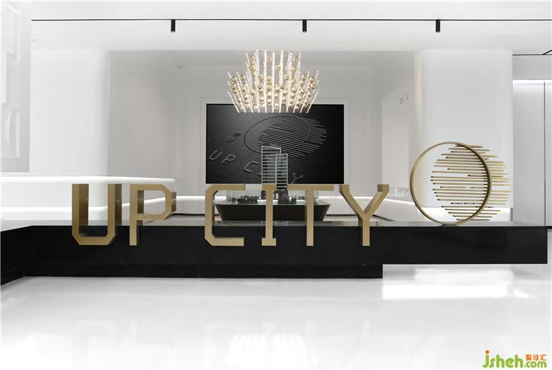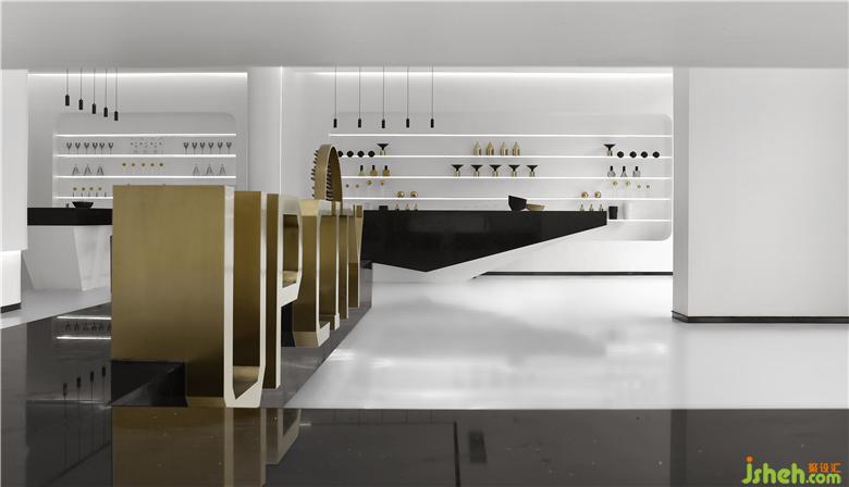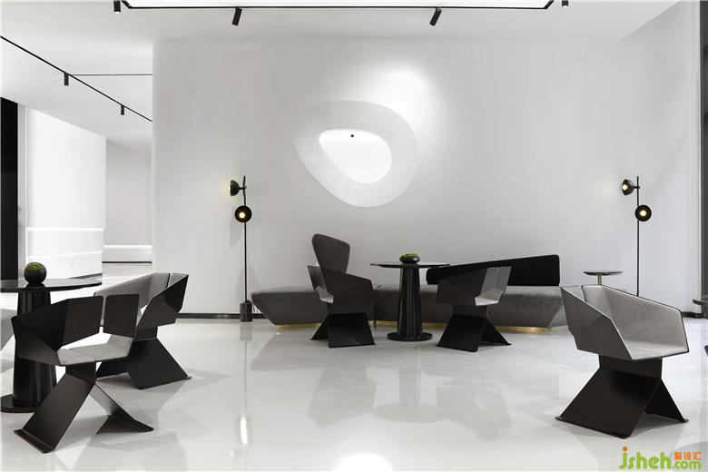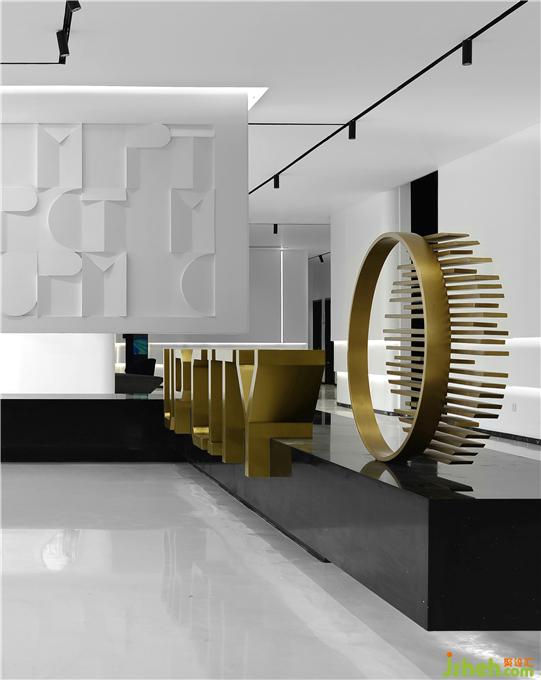 留白,源自于中國(guó)傳統(tǒng)繪畫的構(gòu)圖技巧,以無(wú)形繪有形。在黑與白之間,描刻出形與神的深邃意境,留予人無(wú)限的想象。被這一處白吸了眼,幾縷似水般的光帶,在空間中自由地游走,身影徘徊于明亮與陰影之中,不自覺(jué)的被頂面一道道搖曳的光所吸引著,引導(dǎo)訪客其中漫游,思考,流連。設(shè)計(jì)師拿捏著空間的尺度,通過(guò)對(duì)形體、色彩、質(zhì)感、軟裝來(lái)營(yíng)造一個(gè)頗具性格的藝術(shù)之域,用造型的變化替代多材料的裝飾手法。折線射燈與立面造型相結(jié)合,相應(yīng)可產(chǎn)生深淺變化,形成層次。作品在環(huán)境風(fēng)格上還是取用黑與白之間的對(duì)比,金色為點(diǎn)綴,克制與取舍往往才是走向無(wú)限的通幽之徑。售樓處設(shè)計(jì)