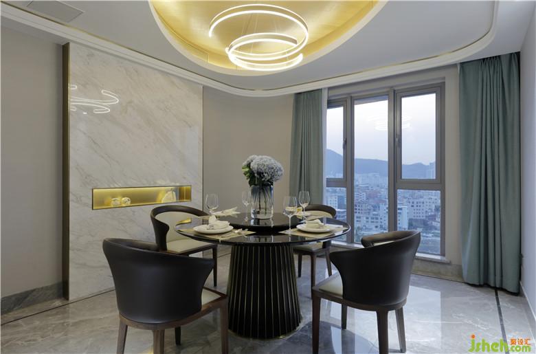餐廳原有的結構調整之后,客餐廳都變得通透開放,通過簡約的手法,化方為圓。延續(xù)尊貴而雅致的氛圍,略帶華麗的環(huán)形吊燈,加上一面通透的落地窗,呈現(xiàn)優(yōu)雅適意的用餐環(huán)境。