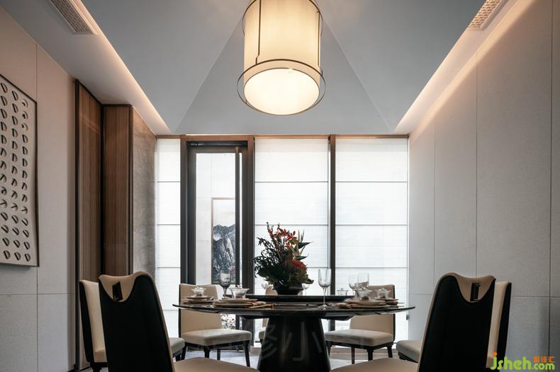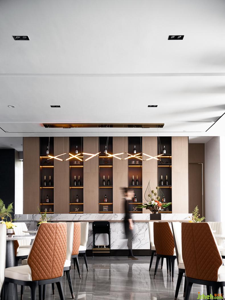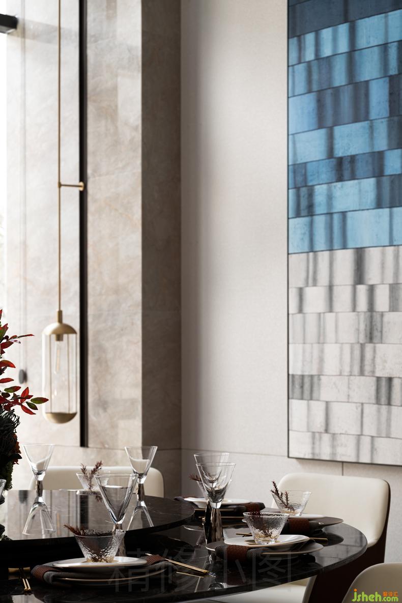 開放式的布局打破空間的界限,點(diǎn)、線、面穿插運(yùn)用于整個(gè)空間,并拌有中式的對稱美學(xué),增添空間的秩序與動(dòng)感。引入空間自然光和空間大面積的落地玻璃加以修飾,延伸出不同的水影之形,水鏡之形,讓具象空間演變?yōu)槌橄罂臻g,醞釀出一首極具寫意韻味的抒情詩。