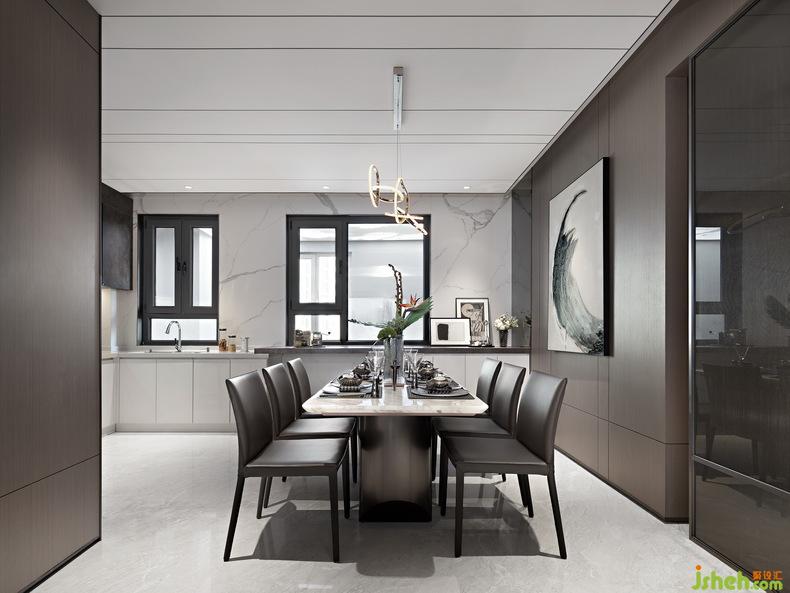 步入餐廳,設(shè)計(jì)師將原本餐廚獨(dú)立的布局打通并融為一體,擴(kuò)大了視覺(jué)空間,樣板房設(shè)計(jì)便于家人間互動(dòng),增進(jìn)彼此交流與溝通。功能上區(qū)分中餐料理區(qū)與西餐烘焙區(qū),讓美食擁有多種誕生形式,滿足家人的味蕾選擇