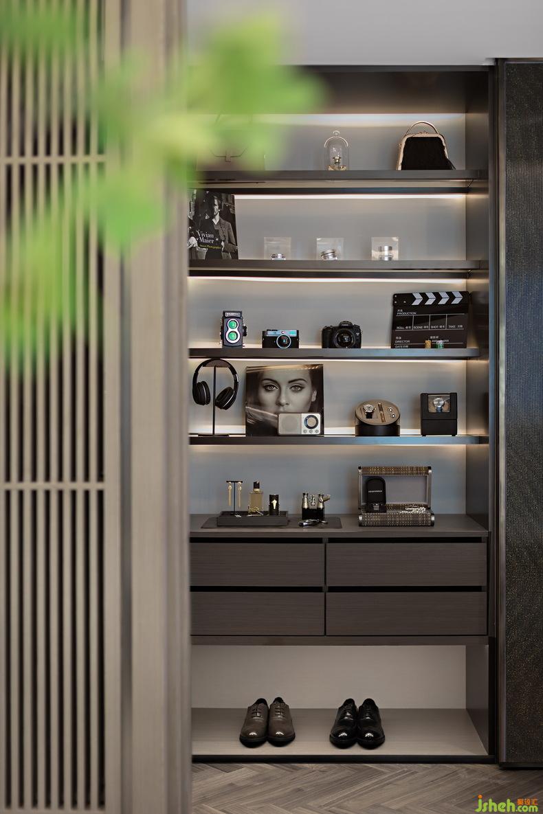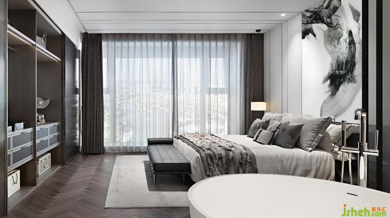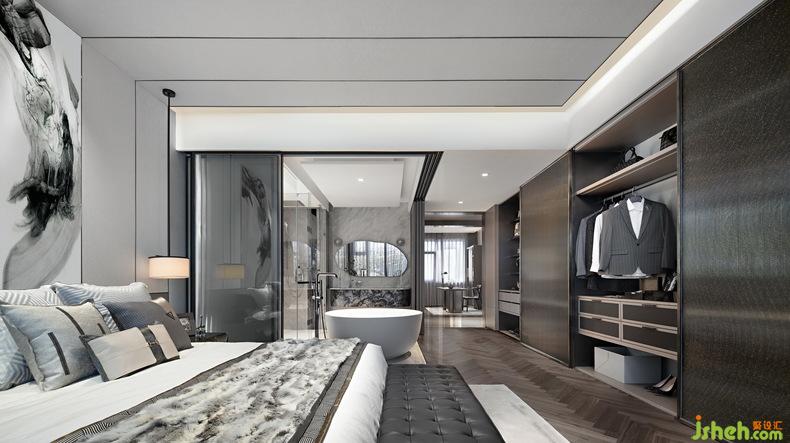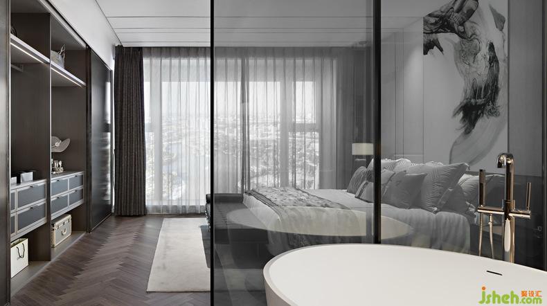 告別傳統(tǒng)式設(shè)計(jì),主衛(wèi)以一面清透材質(zhì)的玻璃,形成與主臥邊界的消解樣板房設(shè)計(jì)。