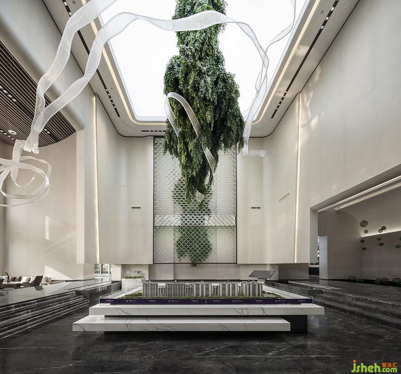 從天垂降的藝術(shù)裝置,以水為脈,以樹為神,綴以古今之脈,籠罩著在底下居住生活的后代子孫,享受生活的溫馨和能量。以“水”為脈絡(luò)貫穿始終,動(dòng)靜相結(jié)合,潤物細(xì)無聲。于一水一木中發(fā)現(xiàn)內(nèi)心,營造一個(gè)“寄情于山水之間”的現(xiàn)代生活方式。