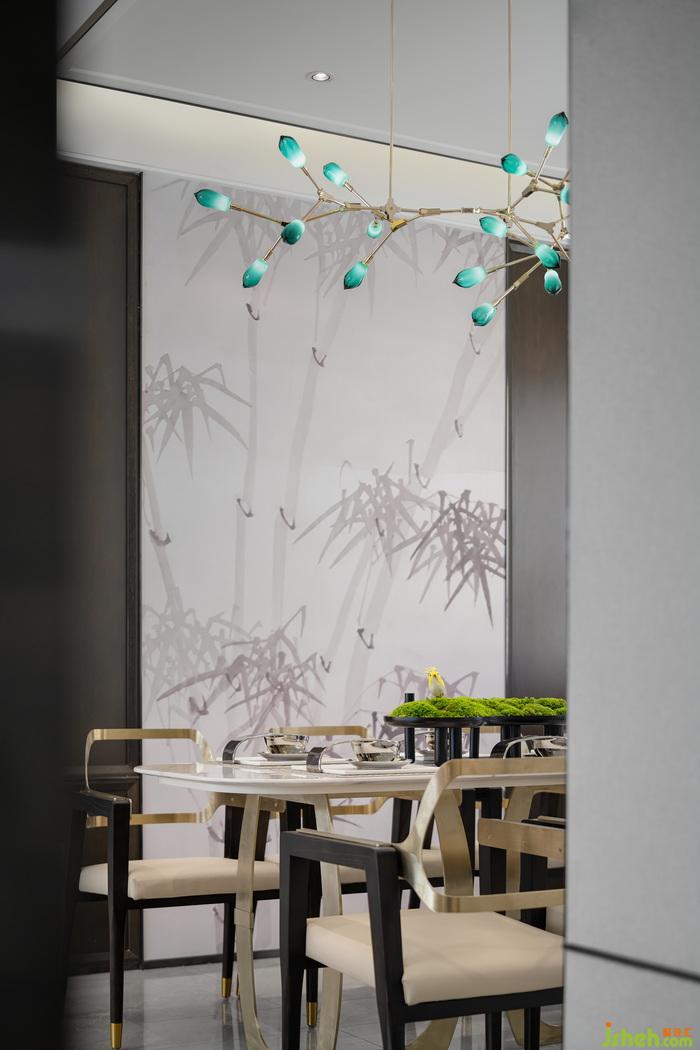 餐廳選用傳統(tǒng)藝術(shù)盆景與品格高遠(yuǎn)的水墨竹畫裝飾,與客廳整體調(diào)性呼應(yīng)。在餐廳處,設(shè)計師還特意增設(shè)西廚吧臺,增添空間配套,以契合現(xiàn)代生活方式,提升居住品質(zhì)。