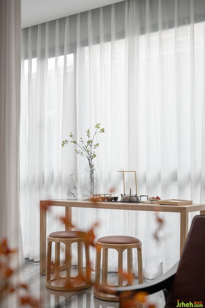 在功能布局上,設(shè)計師于客廳陽臺一隅設(shè)置茶室,樣板間設(shè)計木的溫潤與陽光的溫度在此相遇,勝卻無數(shù)溫柔場景。居者可在此品茗洽談,或自省獨思,不僅是休憩的空間,亦是精神的角落。