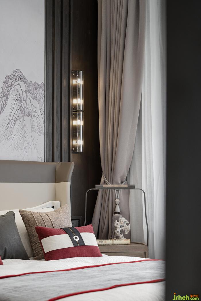 主臥與客臥以沉穩(wěn)的灰、黑色調(diào)為基底,再以干凈素雅的白色進行調(diào)和,些許中國紅點綴其中,東方的美感與韻味悄然輕盈地在空間中呈現(xiàn)。