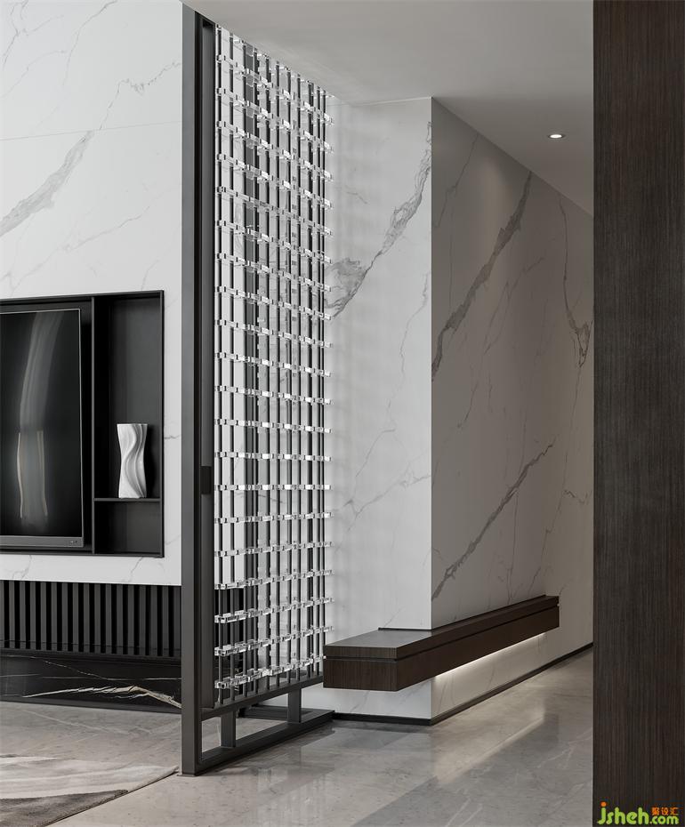 客廳是社交的中心,傳達了契合主人疏朗的個性。格局大氣自帶溫潤感,府邸設(shè)計留白與平靜疏淡的布局,僅于對角置入水晶屏風(fēng),整體讓渡于獲得內(nèi)心秩序與安寧的光。如同一位詩人,懂得欣賞黎明的來臨。