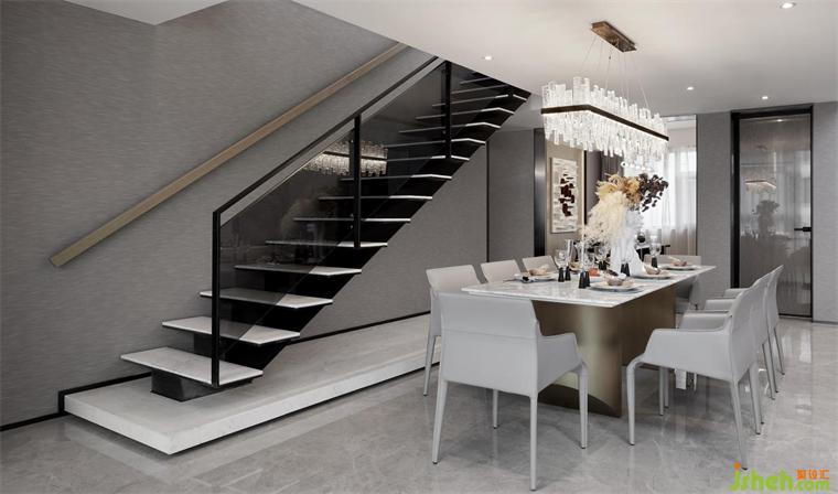 餐廳的設(shè)計(jì)透過消解、打碎與重組等方式,樣板房設(shè)計(jì)去構(gòu)建空間的感染力。你會(huì)看到,這里就是一個(gè)過渡與連接的空間。它與客廳和茶室遙相呼應(yīng),樓梯的存在又與二層臥室界定了無形的領(lǐng)域關(guān)系。