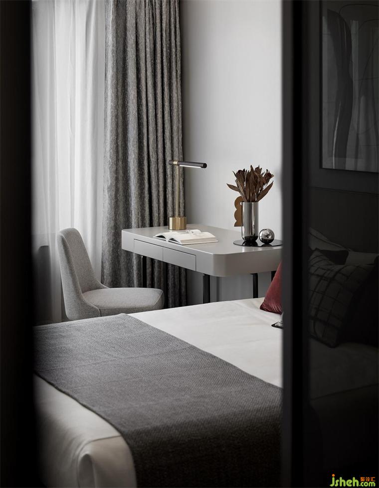 二層主臥克制守序,色調(diào)柔和,氛圍舒心,家具、樣板房設(shè)計(jì)用色和裝飾美學(xué)混用,不管窗外如何喧囂吵鬧、紅塵紛擾,你只想沉浸于此。它不僅是身體的??刻帲蔷竦臈⒌?。
