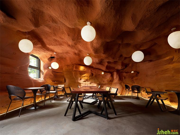 附樓的下沉區(qū),是餐廳意識(shí)的轉(zhuǎn)換指引,圓形吊燈在巖洞一般的餐廳中,廬山民宿設(shè)計(jì)創(chuàng)造著景致的循環(huán)相生。未經(jīng)打磨的粗糲紋理,新舊表達(dá)的碰撞間,石、夯土等天然材料的使用,是為了尊重當(dāng)?shù)靥烊坏纳鷳B(tài)系統(tǒng)和生物多樣性的可持續(xù)性概念。