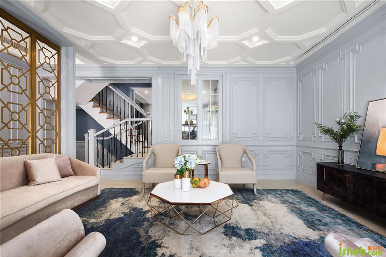 一樓借助原始結(jié)構(gòu)存在的地勢(shì)高差,躍層設(shè)計(jì),室內(nèi)設(shè)計(jì)師使得整個(gè)空間層次分明。進(jìn)門處金屬屏風(fēng)的應(yīng)用,讓個(gè)性化元素跳躍其中,每一個(gè)回轉(zhuǎn)皆是一個(gè)驚喜。造型獨(dú)特的天花,別致的流蘇吊燈,素雅的絨布沙發(fā),配以大理石茶幾,打造溫馨舒適的氛圍。