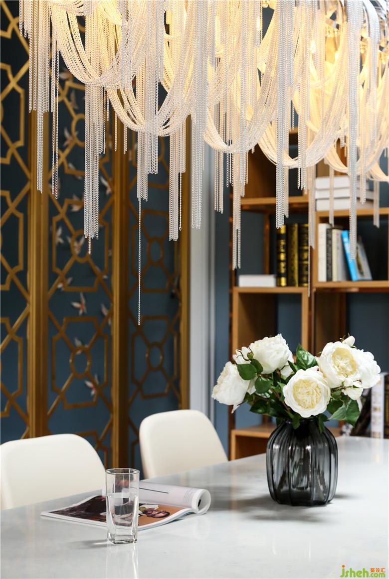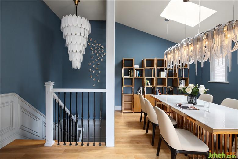 家中的點(diǎn)點(diǎn)滴滴,我們都會發(fā)現(xiàn)業(yè)主對生活的熱愛,理性感性纏繞中和,在三層的多功能廳顯現(xiàn)更甚。樓梯間羽毛燈源,優(yōu)雅、朦朧、內(nèi)斂;獨(dú)特的主燈,不規(guī)則的書柜,金屬的搭配,相互交織,在主色調(diào)藍(lán)灰色的空間內(nèi),給予了生活的激情。