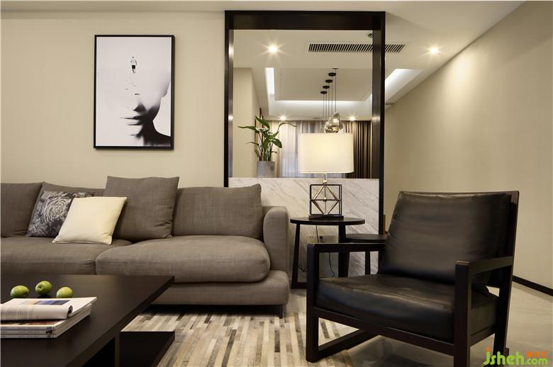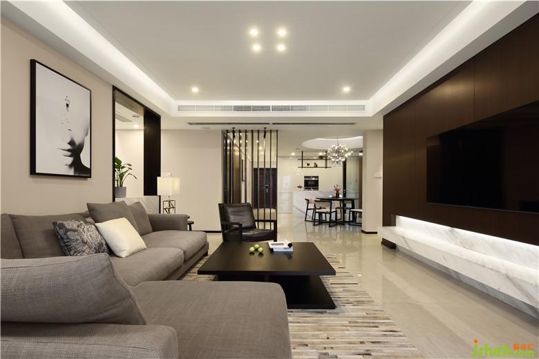 客廳室內(nèi)設(shè)計(jì)師以深胡桃木為主調(diào),輔以爵士白大理石,明暗對(duì)比相得益彰;頂面去繁就簡(jiǎn),既沒有復(fù)雜的造型,也沒有主燈的累贅。設(shè)計(jì)師以極簡(jiǎn)的手法,將點(diǎn)光源與線光源融合一體,構(gòu)成和諧的照明系統(tǒng)。