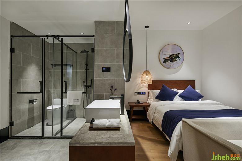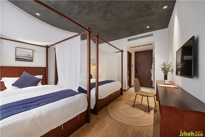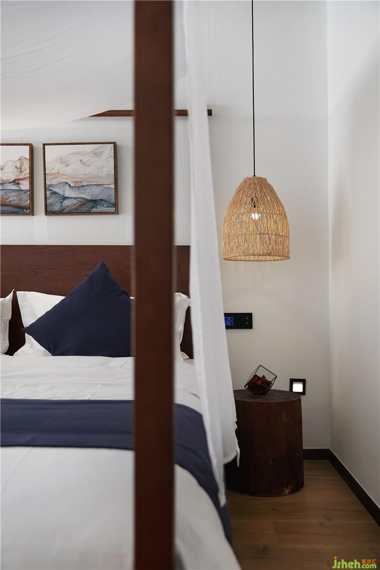 “采樵入深山,山深樹(shù)重疊”。設(shè)計(jì)師對(duì)于室內(nèi)空間整體裝飾上想要營(yíng)造出深山木屋的質(zhì)樸自然、又不失新意的氛圍。房間運(yùn)用了大量的手工藤編藝術(shù)燈具,柔和的光線透出藤編的紋絡(luò),質(zhì)樸溫馨,視感震撼。在質(zhì)樸的基調(diào)上,灰色藝術(shù)涂料與山水藝術(shù)掛畫(huà)給空間增添了濃厚的寫(xiě)意風(fēng)情。輕盈白紗透出的柔和日光映在地板上,靜謐的空間,舒適的座位,靜靜品一盞茶也能悠閑寫(xiě)意,細(xì)數(shù)著輕松假日。老木頭、棉麻、藤編、石材元素搭配適中,冷暖交替,相互映襯,極好得展現(xiàn)了自然質(zhì)樸之視覺(jué)體驗(yàn)。室內(nèi)設(shè)計(jì)師以及酒店創(chuàng)始人都寄望來(lái)客在這里能卸下所有的包袱,把身與心交予自然,讓心靈度個(gè)假。