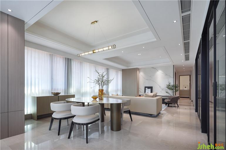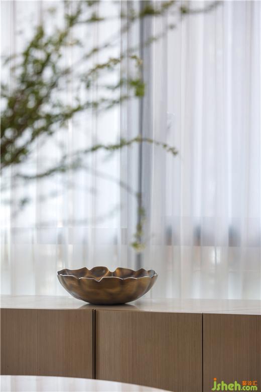 設(shè)計師關(guān)注軟裝細(xì)節(jié)的連續(xù)性,以此凸顯視覺延展的意趣?;⌒螏r板餐桌搭配白色圍合式皮紋餐椅,橘棕色玻璃花器點(diǎn)綴其中,木色餐柜與墻面色彩呼應(yīng)。大平層裝修設(shè)計圓筒狀吊燈灑下柔和的光線,簡潔的色彩,多層次的材質(zhì)串聯(lián)起一日三餐的儀式感。