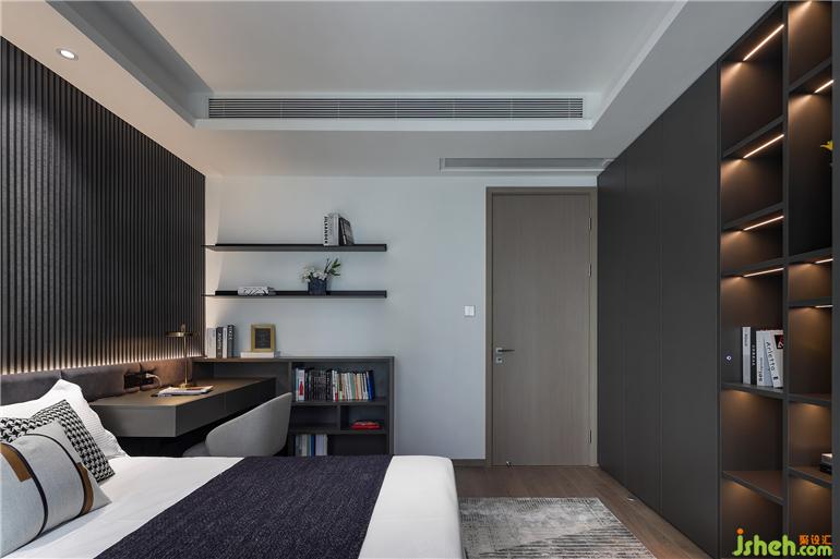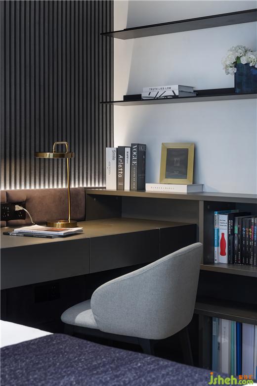 兒童房將空間面積合理利用,根據使用者的身份設置為酷黑風格。大平層裝修設計基于實用功效的考量,打造集衣柜、書柜、學習桌、懸浮柜等多元功能的一體式柜體,提供了充沛的收納空間。多層次光源組合柔和了居室氛圍,為孩子打造一方成長的天地,每天的起居都充滿活力。