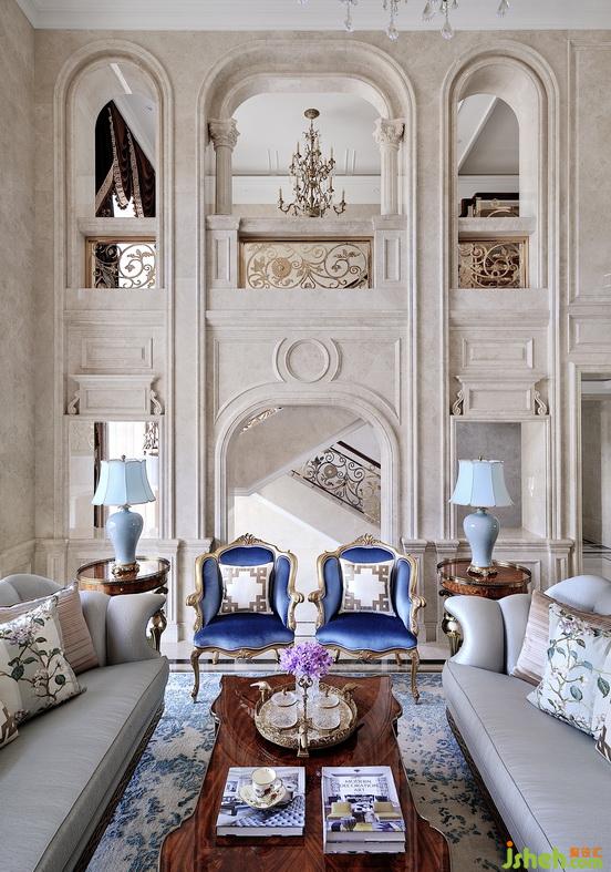 設(shè)計(jì)師最終選擇藉由新古典主義的尊貴大氣與灰藍(lán)色系的溫柔雅致打造業(yè)主想要達(dá)到的高級感。別墅裝修設(shè)計(jì)