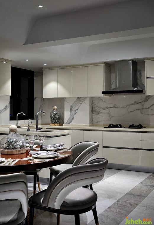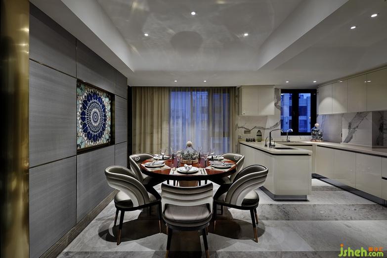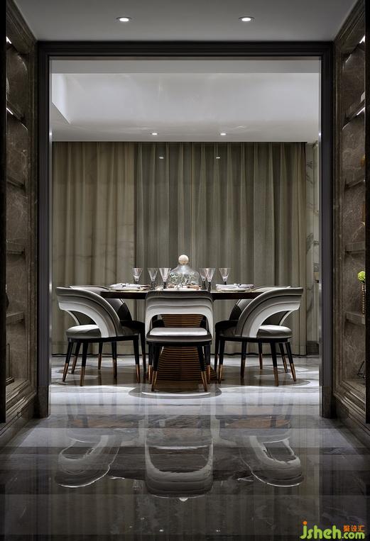 餐廳空間延續(xù)了整體的灰調設計,皮革、金屬、玻璃、大理石、布藝窗簾之間的質感與色彩對比,在高級灰里融合共生,加之極致的細部設計與精湛的工藝,大大增加了空間的可讀性與體驗感。室內設計師