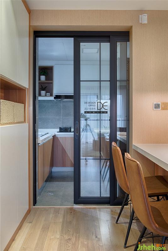 由于廚房進(jìn)口位置較窄,室內(nèi)設(shè)計(jì)師采用雙滑門(mén)重疊設(shè)計(jì),把門(mén)隱藏于冰箱旁邊。這樣全部打開(kāi)使用時(shí)也比較方便,不在家時(shí)可以把門(mén)關(guān)起來(lái),也解決了業(yè)主養(yǎng)貓的顧慮。