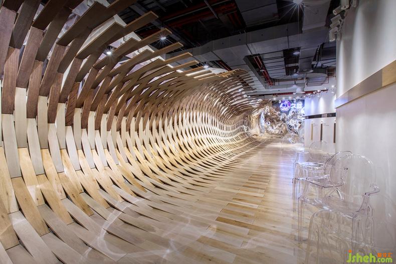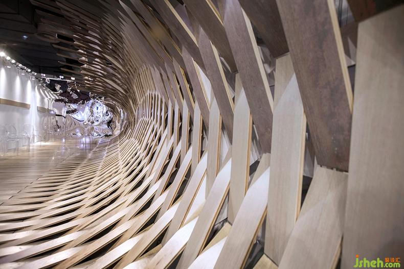 TOWOdesign又將水的美學潛質(zhì)再度延展,以充滿變幻的水流形態(tài)為靈感,打造出一幕極具視覺沖擊的雕塑。每一塊地板部件都被賦予液體形態(tài)的流動旋律,但又包含著木質(zhì)的靜態(tài)紋理。