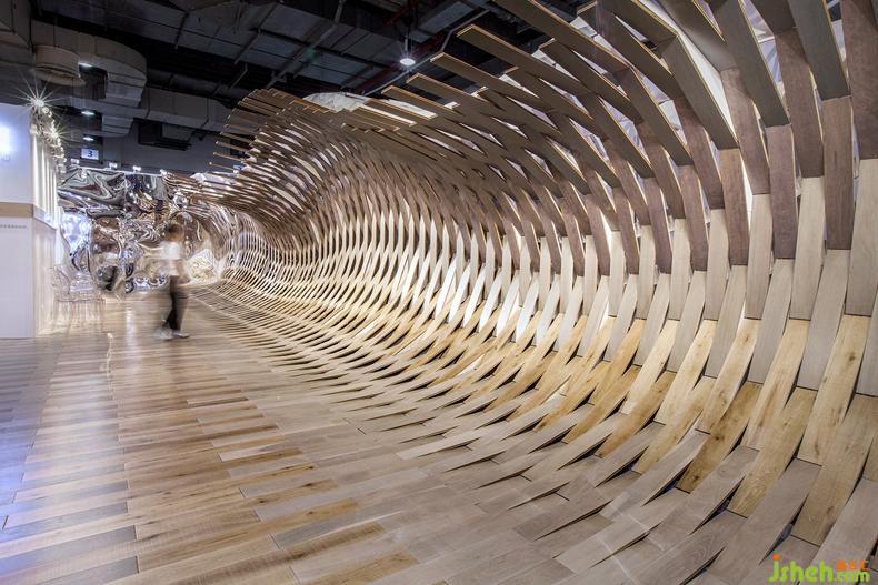 一道起伏奔涌的木色“水浪”橫亙于展館一側(cè),猶如被一股天外旋風撩動般從水平地面上騰空而起鋪卷開來。裝置背部以參數(shù)化設計搭建骨架,不同地板展品依據(jù)顏色深淺拼接交疊,呈現(xiàn)水紋律動一般的空間節(jié)奏和木紋隨年月漸變的視覺色譜。裝置縱向兩端的鏡面借助反射作用構(gòu)成水浪的延伸,將有限的展廳進行了無限的擴展,同時又有一種夢幻迷離之感。