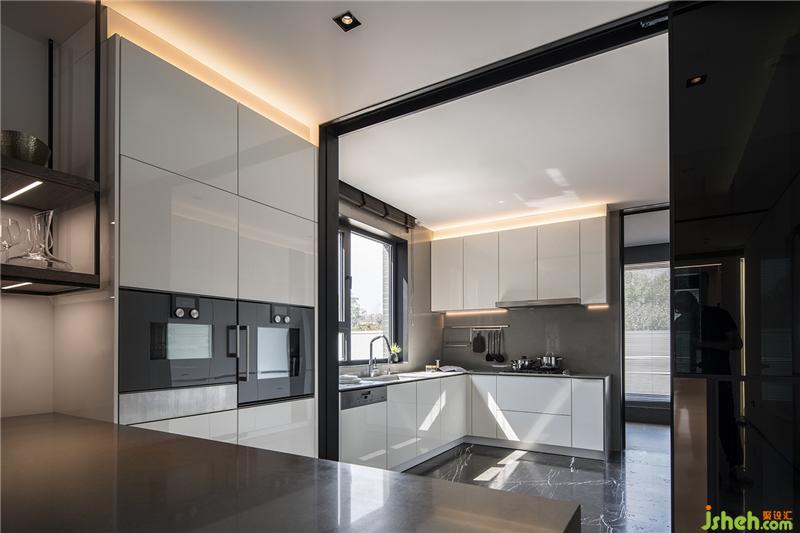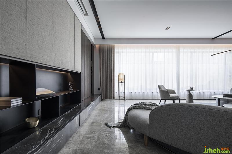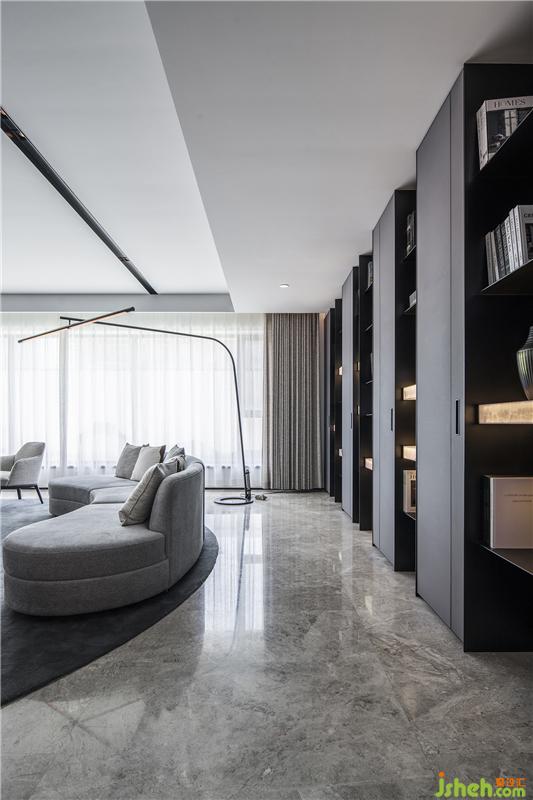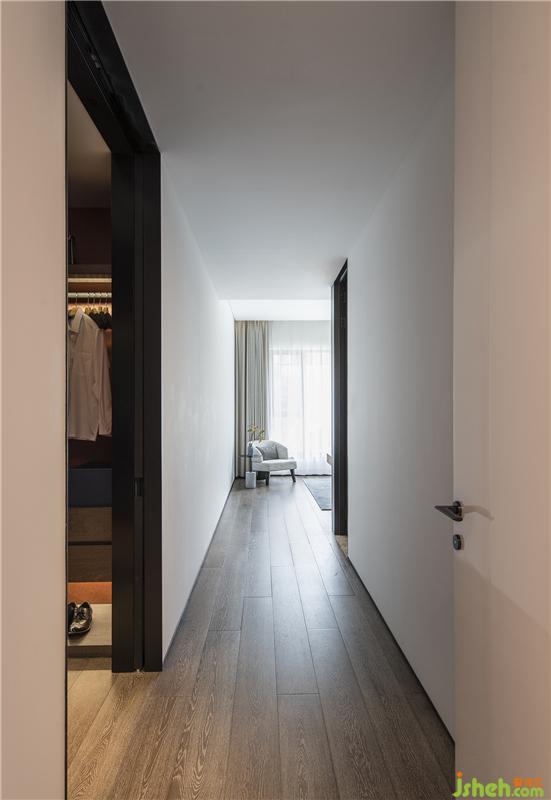 一入玄關(guān)即為一開放空間,客聽、玄關(guān)、走廊、餐廳,用微建筑的概念創(chuàng)造出一條私密的軸線,最適當(dāng)?shù)膶菍釉撚械臋C(jī)能,都縝密的收在這條軸線,合于空間。承襲著樣板間的脈絡(luò),將現(xiàn)代/簡單/純粹/人文/生活等元素用更大的建筑語匯去執(zhí)行整個平層空間,用機(jī)能化的柜體創(chuàng)造室內(nèi)建筑般的量體、軸線等概念??吐牬竺娣e的書墻除了造型層面之外,更加賦予空間產(chǎn)生在人文方面的強(qiáng)烈氣息。