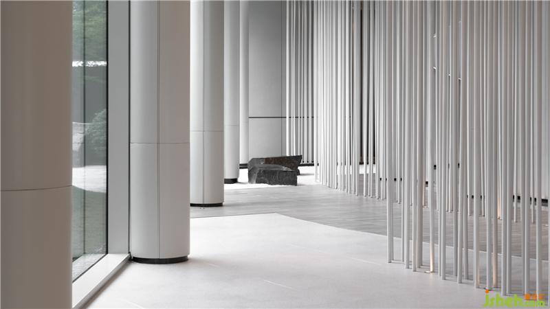 虛實錯置的量體中,霧玻如煙,搭配疊織交錯的金屬圓管,延伸入天花,除了創(chuàng)造綿延的錯覺,也呼應(yīng)江水反射的意象,映照水天一色。