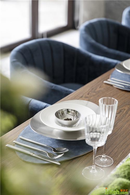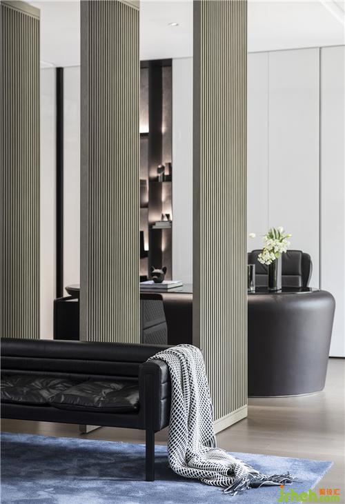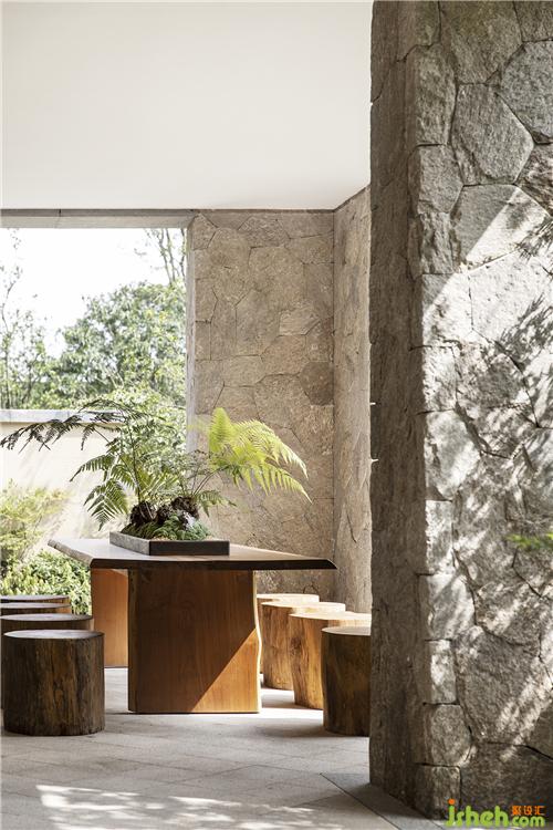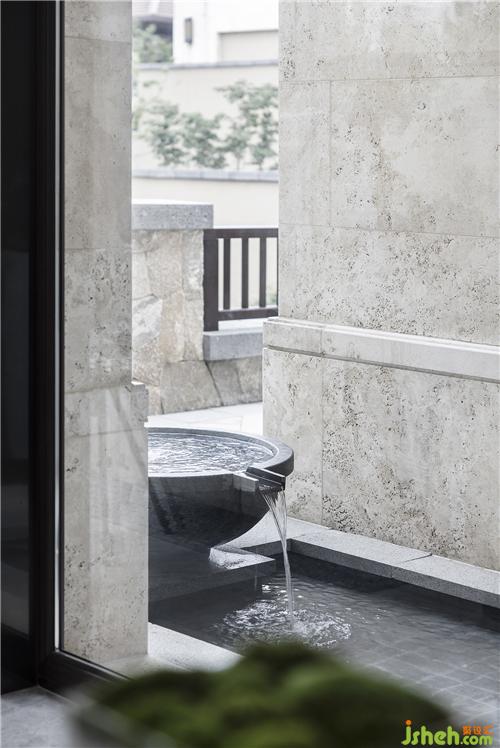 眼看清山之景,耳聽流水之聲,材質(zhì)的運(yùn)用借景好似倒影在室內(nèi),透過大理石壁面轉(zhuǎn)折到地面的手法,加上錯(cuò)拼分割的律動(dòng),讓空間刻畫出山的脈絡(luò)。