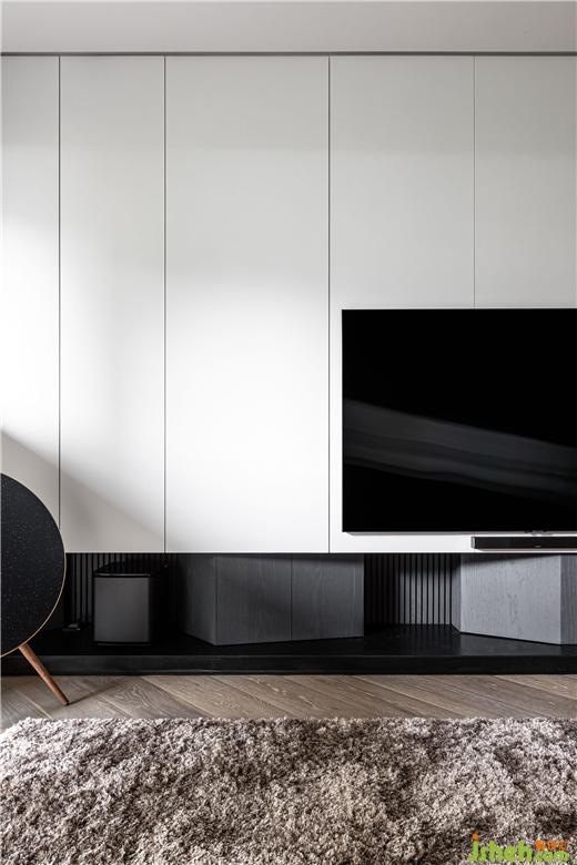 玄關(guān)的木飾面律動(dòng)性的轉(zhuǎn)折延伸至客廳空間,包覆并隱藏了大型收納柜體。