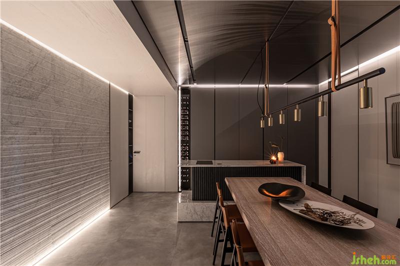 魚鱗板造型的鞋柜作為玄關(guān)與餐廳空間的中介量體。