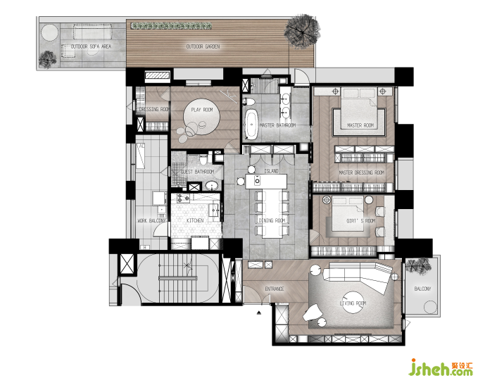 主浴與游戲室皆可通往戶外露臺,現(xiàn)代利落的景觀規(guī)畫,營造大空間感,一邊看著小孩們玩耍,與家人親友小酌,愜意不過。