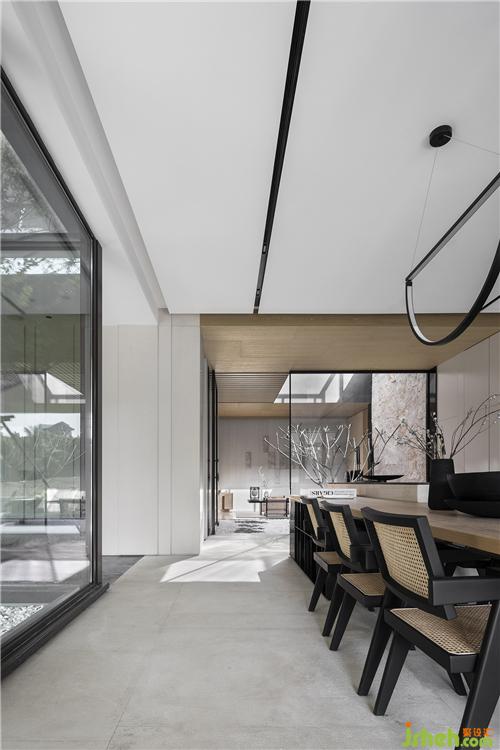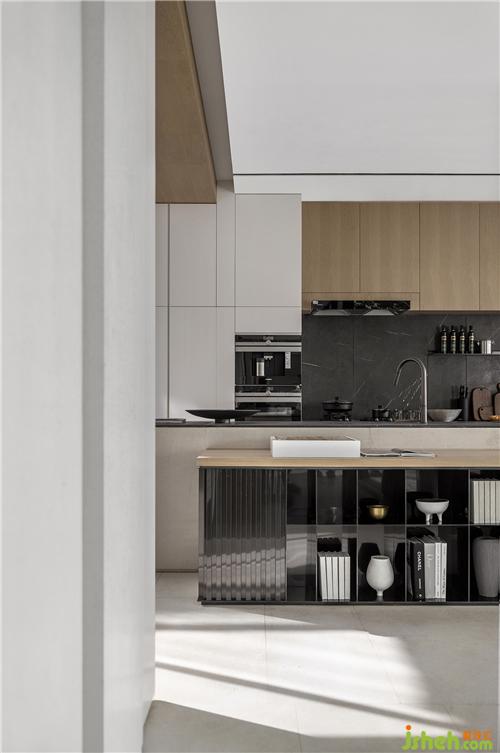 透過長(zhǎng)廊凹凸進(jìn)退墻面的引導(dǎo),我們來到開放式的西廚區(qū)域,前后穿透的空間感,