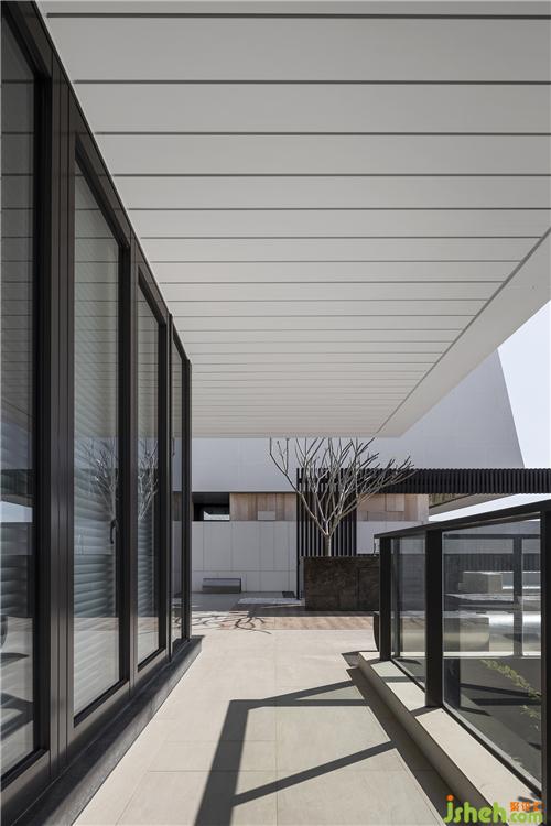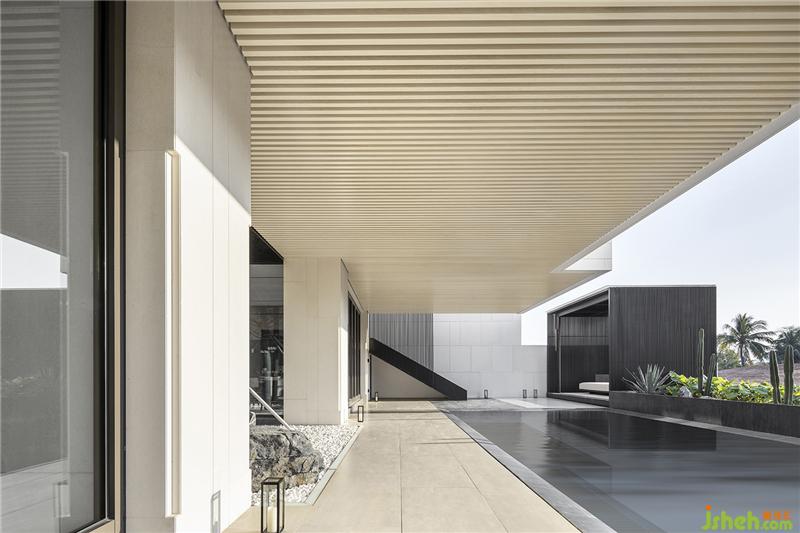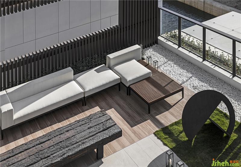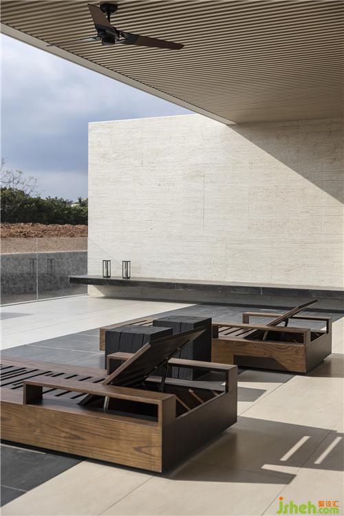 從茶室穿越到戶外泳池,賓客用餐舉辦派對(duì)的同時(shí),可享有前后兩端不同的景觀河水潺潺流動(dòng)的聲音,乘著風(fēng)穿過泳池流進(jìn)耳里,后方茶室靜謐的氛圍,光線被樹葉打散灑落在地面上,映著最深沉的石紋。