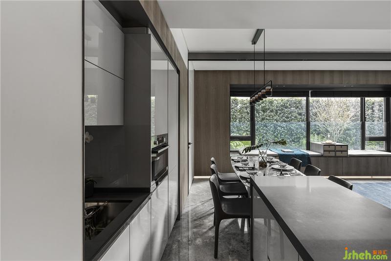 通過大氣的金屬噴黑邊框黑玻璃拉門,可開闔的廚房活動式彈性空間深圳樣板房設(shè)計,減去了厚重的墻面隔屏同時降低視覺重量。