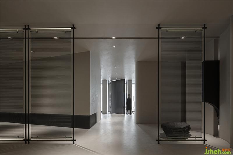 步入展廳,借助材料本身的特質(zhì)傳達(dá)寂靜、溫潤的空間基調(diào),細(xì)節(jié)中墻面穿插不同型態(tài)的藝術(shù)裝置,與微水泥的特性產(chǎn)生強烈的對比,堅硬與柔軟、力量與溫柔豐富空間語言,同時在視覺上藝術(shù)品的懸浮感,增加空間靈動。
