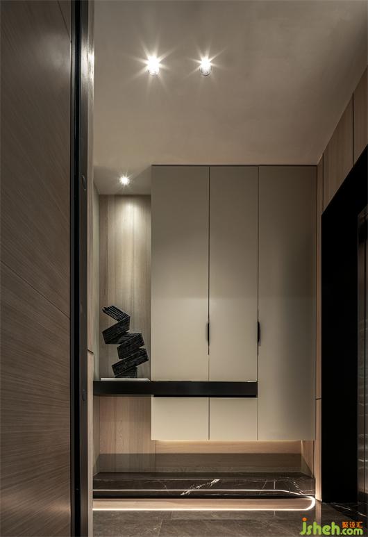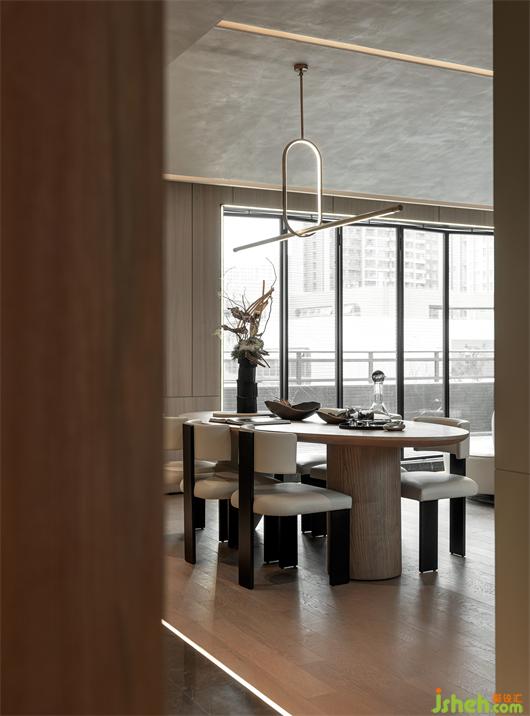 本案以溫潤的木皮紋理與柔軟的墻布做為基底,奢石與不銹鋼的結(jié)構(gòu)作為空間的互動對比關(guān)系。樣板間設計將空間做中垂直水平的分割,使其量體彰顯輕奢感,延續(xù)其型態(tài)轉(zhuǎn)折至不同空間。