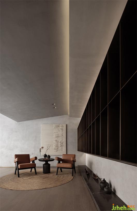 入口玄關(guān)處木皮與微水泥形成材質(zhì)交疊對比,創(chuàng)造重點空間轉(zhuǎn)換的心理感受。