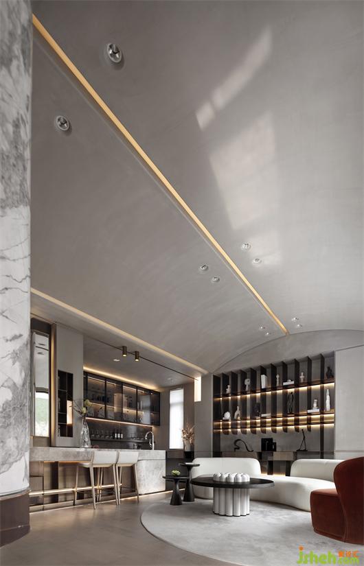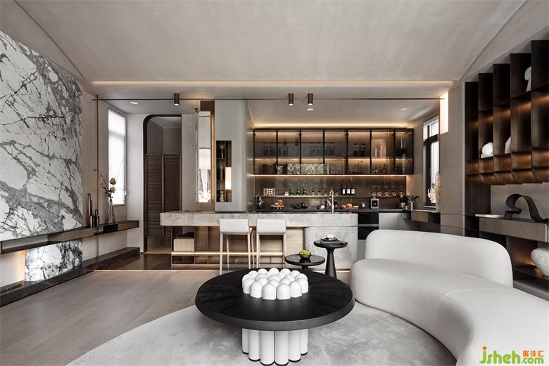 客廳設(shè)計(jì)延伸了客廳的多維想象及藝術(shù)審美的無限可能,黑白水墨紋的大理石,配合金屬的吧臺(tái),搭配精致的器皿,一幅城市墨畫定格時(shí)間的會(huì)客空間。