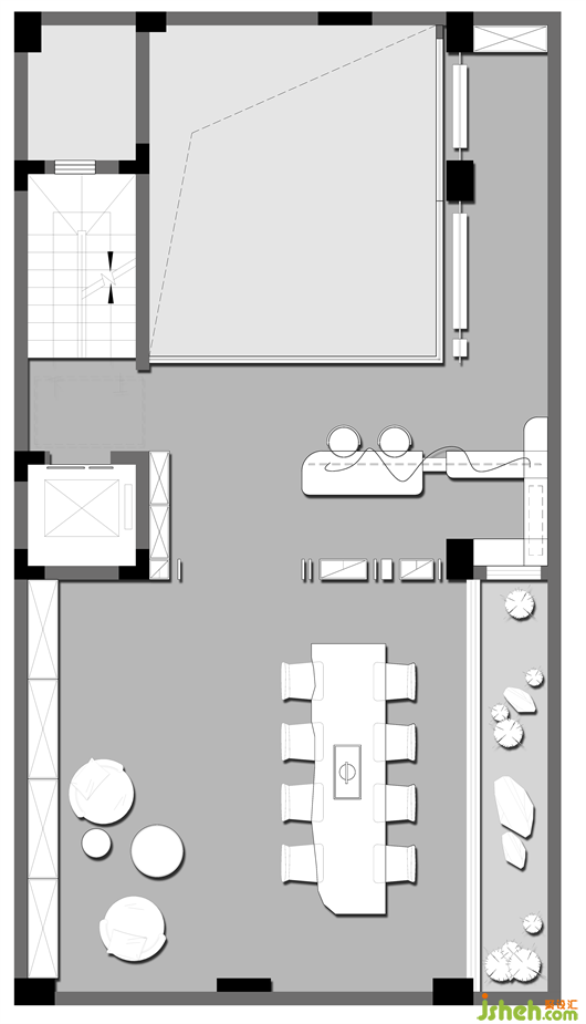 在夾層區(qū)域設置冥想?yún)^(qū),當車水馬龍、摩肩擦踵成為城市的代名詞,當快節(jié)奏的步調(diào)成為生活常態(tài),載浮載沉在忙碌且日復一日的時間洪流。配合室內(nèi)天井,垂直向度的連結,沒有喧囂浮躁,取而代之是一片靜謐與安寧。