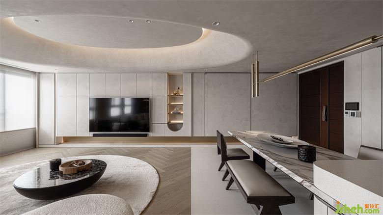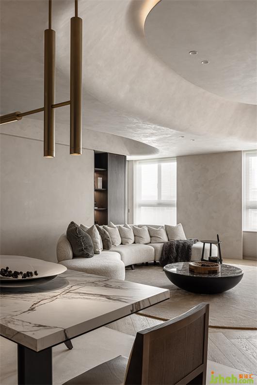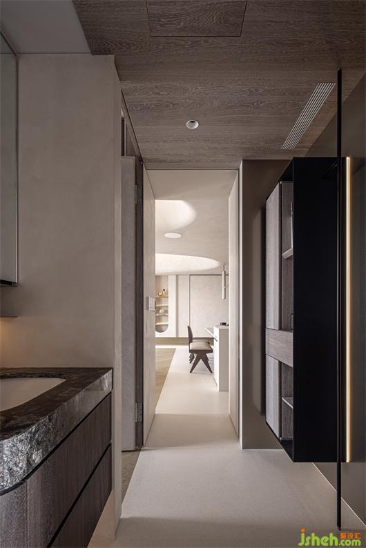 中性的空間背景,自然質(zhì)感的木質(zhì)元素,結(jié)合空間中柔軟的織物與局部石材、金屬的點綴,讓空間呈現(xiàn)更干凈時尚且?guī)в袦剀盎{(diào)