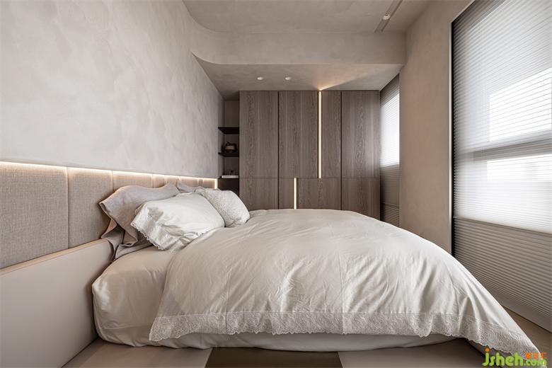 豪宅設計房間沿用微水泥與木地板的搭配,整體樸實的色調(diào),加入柜體崁燈和弧線的平衡,床頭以皮革與壁布搭配,將空間的尺度最大的保留給生活空間,床頭內(nèi)崁燈將空間氛圍呈現(xiàn)更為溫柔的氣息。