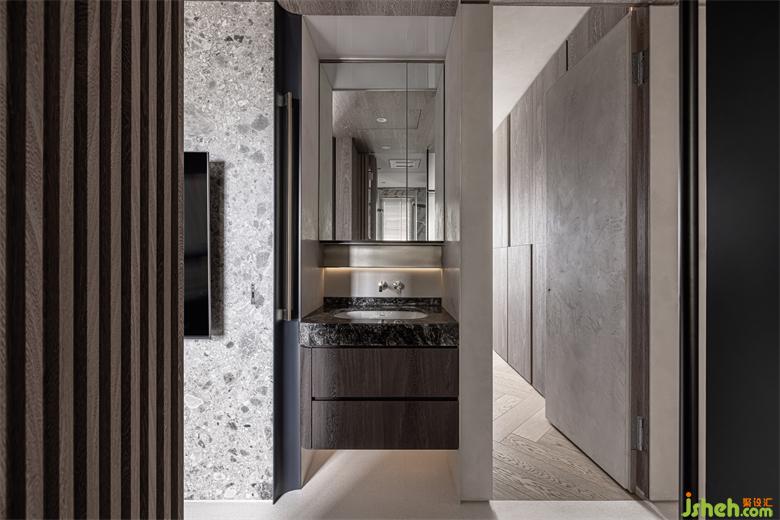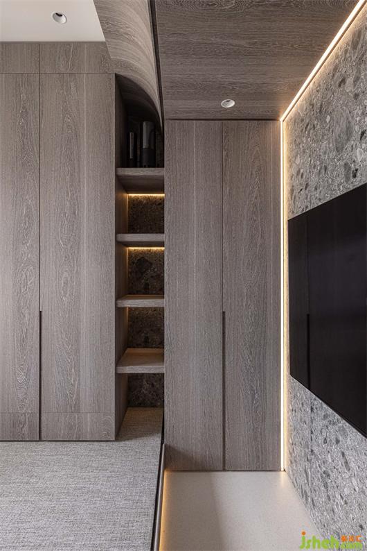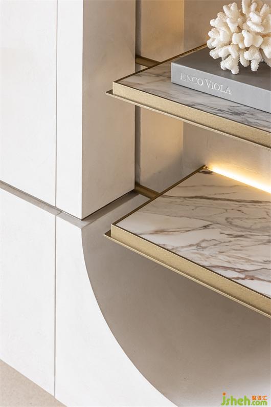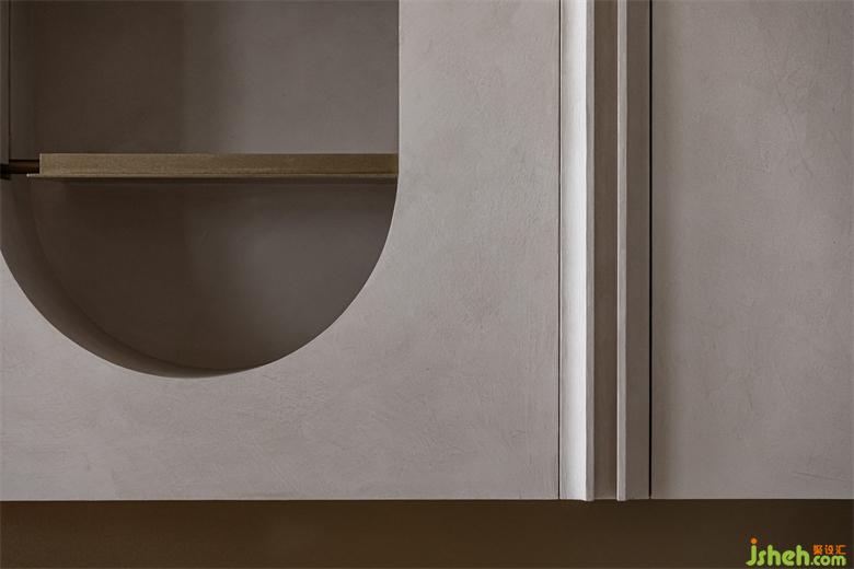 有如空中洞穴般,讓屋主兩夫妻可以在高樓層享受自然的樸實(shí)生活,環(huán)形的動(dòng)線,豪宅設(shè)計(jì)讓每個(gè)空間都能相互連結(jié),開(kāi)闊的客餐廳,能讓陽(yáng)光灑落在每個(gè)角落,利用兩個(gè)大弧形造型天花板,營(yíng)造出洞穴的有機(jī)感,減少空間銳利的線條及弱化建筑的結(jié)構(gòu)大梁,香繽色的鐵件就有如洞穴里的結(jié)晶,閃閃發(fā)光。