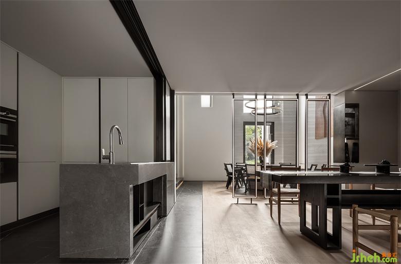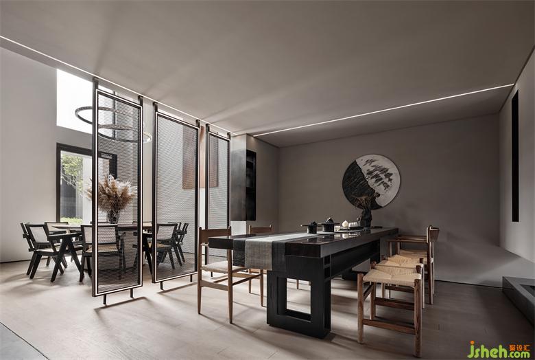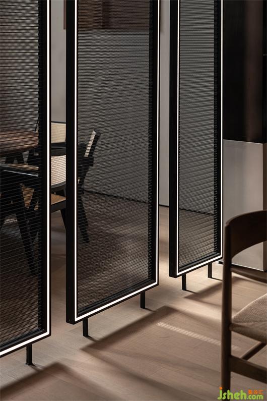 前廳的島臺(tái)與水吧臺(tái)透過墻體穿插連續(xù)在一起,“天際線”的光線延續(xù)了空間,將彼此牽引在一起。武漢會(huì)所設(shè)計(jì)平滑細(xì)膩黑鈦不銹鋼與富有肌理感的微水泥塑造沉靜感的異形空間,溫潤(rùn)的木皮與冰冷的石材裝裱空間的張馳華麗。