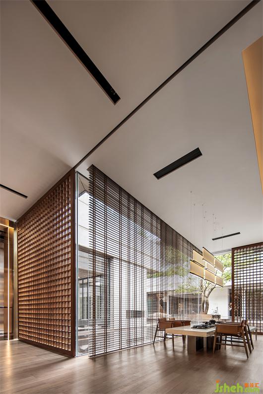 在漂浮的兩個盒子中,洽談區(qū)透過折門的運用,將沙發(fā)區(qū)整體空間打開與中庭水面連結,將內外空間連成一體,雨天時可以在沙發(fā)上細聽雨聲。茶室則是以較低臺度的家具設定,接近席地而坐的高度讓使用者與水面的尺度感更親近一些,并透過格子窗扇,在黃昏時讓交錯的光影灑落在茶室的空間之中。