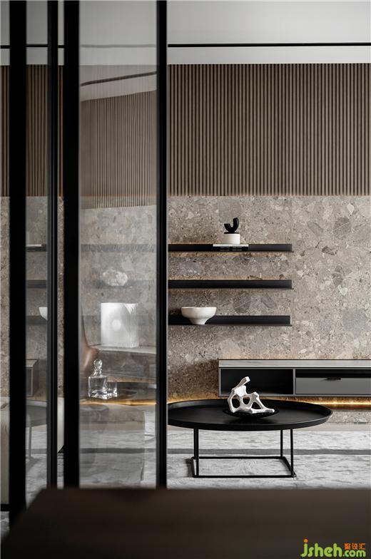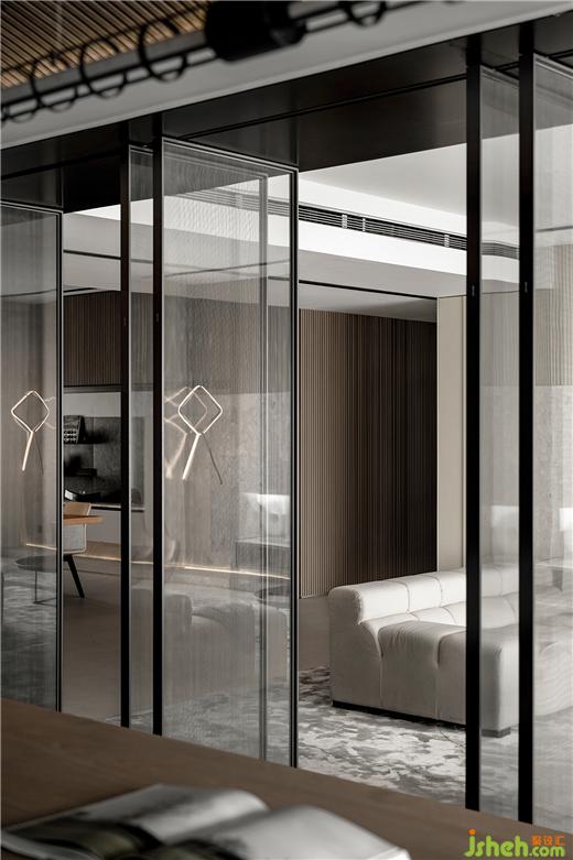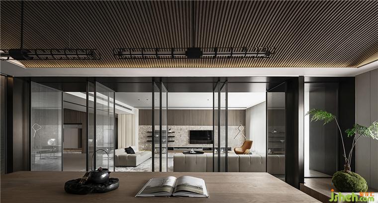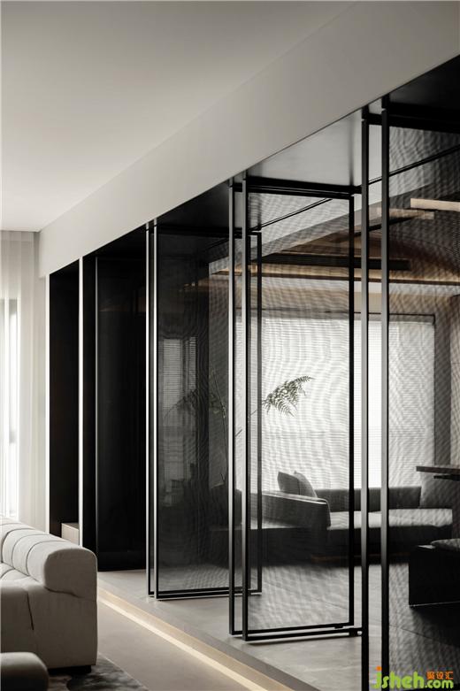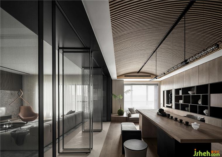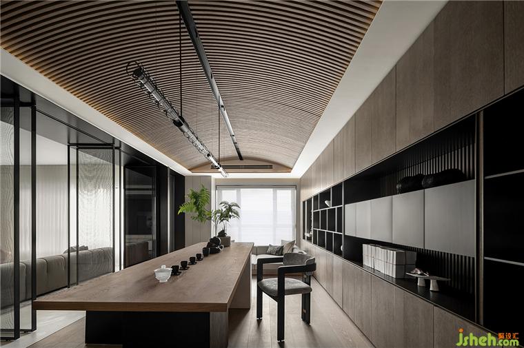 茶室.會客區(qū)整體抬高處理,天地軸玻璃門分空間區(qū)域,形成主人靜謐獨立的空間。