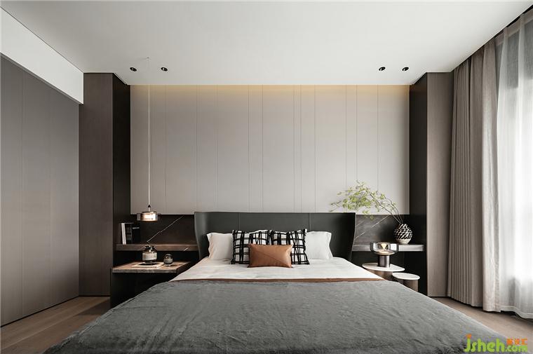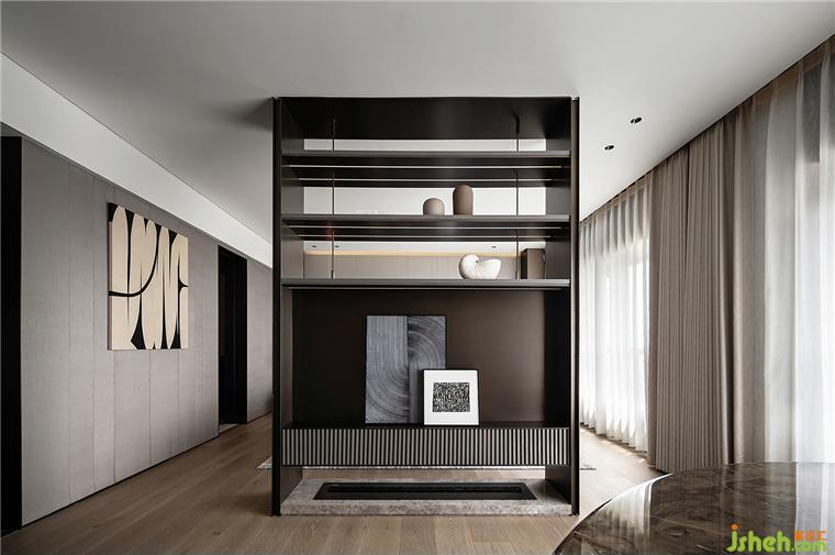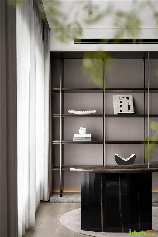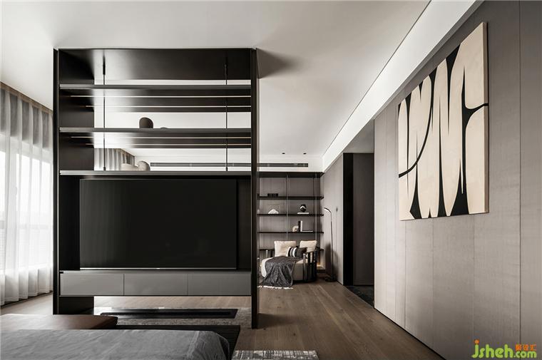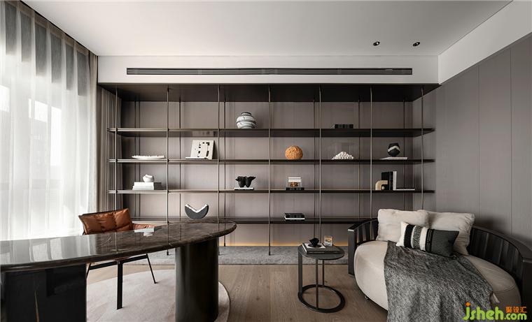 主臥睡眠區(qū)和書房之間的半墻,分別做電視墻和展示柜。臨沂豪宅設(shè)計(jì)通過界定而非阻隔空間的方式使整體空間上具備連貫性。
