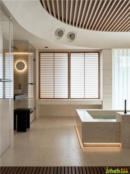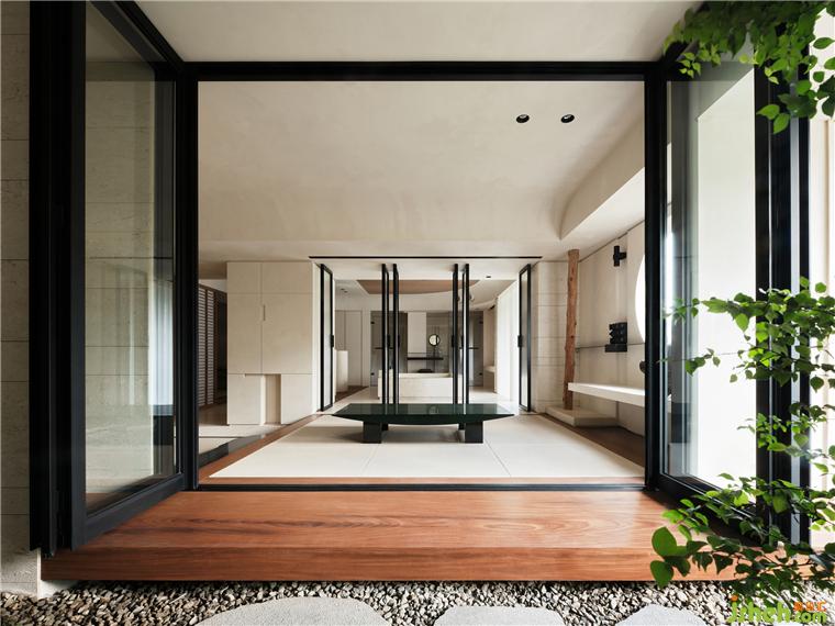 日本建筑師石上純也在其著作《自由建筑》中談到建筑與風(fēng)景的辯證關(guān)系是這樣說的:“在不變的美麗風(fēng)景之中,探索空間,什么也不建造,只是把現(xiàn)有的發(fā)掘出來創(chuàng)造建筑即發(fā)現(xiàn)新的世界?!?br /> 茶室的圓形對景便是北投公園,打開茶室的折疊門與旋轉(zhuǎn)門,榻榻米茶室便能與泡浴區(qū)及庭院相連,最大限度地打開風(fēng)景的可視度,讓日常沉浸于自然風(fēng)景中。榻榻米下沉的重心,讓心靈更貼近大地,更親近庭院,將簡樸、自然、詩意、神秘、平靜、愉悅?cè)跒橐惑w,令人心曠神怡。