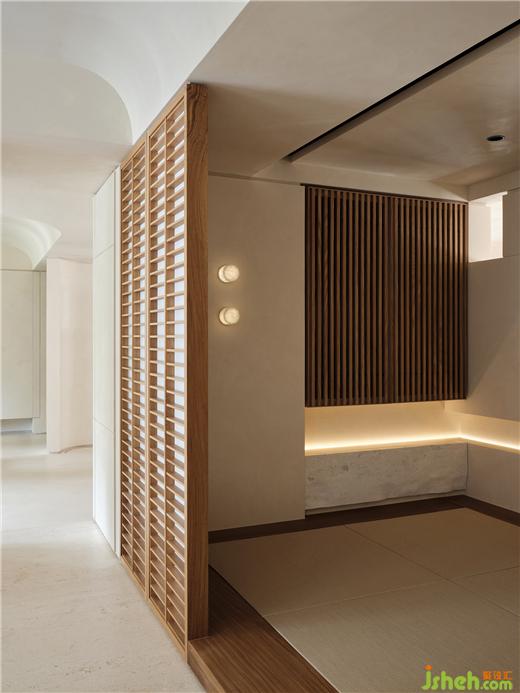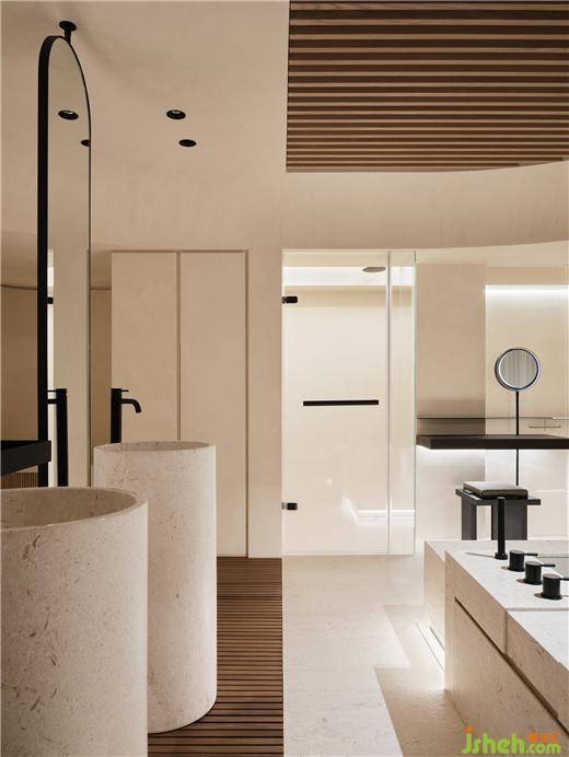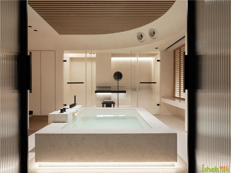 因有得天獨(dú)厚的天然溫泉,泡湯為本案注入了令人期待的沉浸式自然體驗(yàn)。浴池設(shè)計(jì)在浴室的中間,簡潔而質(zhì)樸的浴池,被流水沖刷洗滌過的自然石材,溫泉度假別墅裝修設(shè)計(jì)賦予了溫潤如玉的肌理體感。