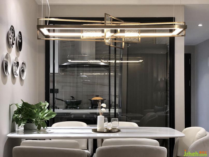 由于業(yè)主喜歡線條感強(qiáng)的吊燈,不是爛大街都能買到的,所以餐廳的吊燈找了很久。而餐桌依舊選用魚肚白搭配米白色椅子。