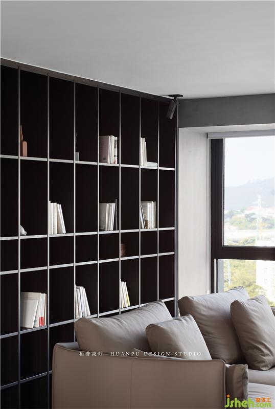 客餐廳格局調(diào)換之后,客廳更為方正,電視背景墻設置大面收納柜,滿足了客廳的收納功能,電視內(nèi)嵌,融合整體,不顯突兀。背面整面書柜也與背景墻作呼應。