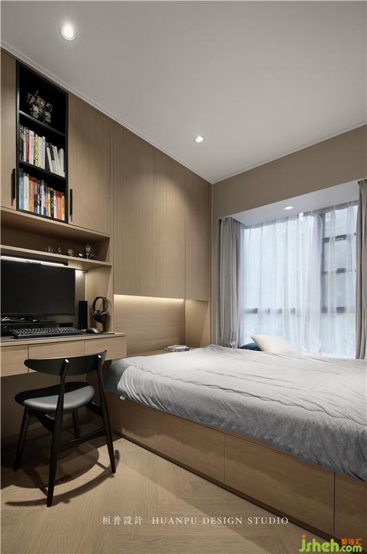 次臥同時兼?zhèn)鋾亢涂头康淖饔?,墻面是整片的儲物柜,整體色調(diào)同樣偏低飽和,無論是平時工作還是客人入睡,都會相當舒適。